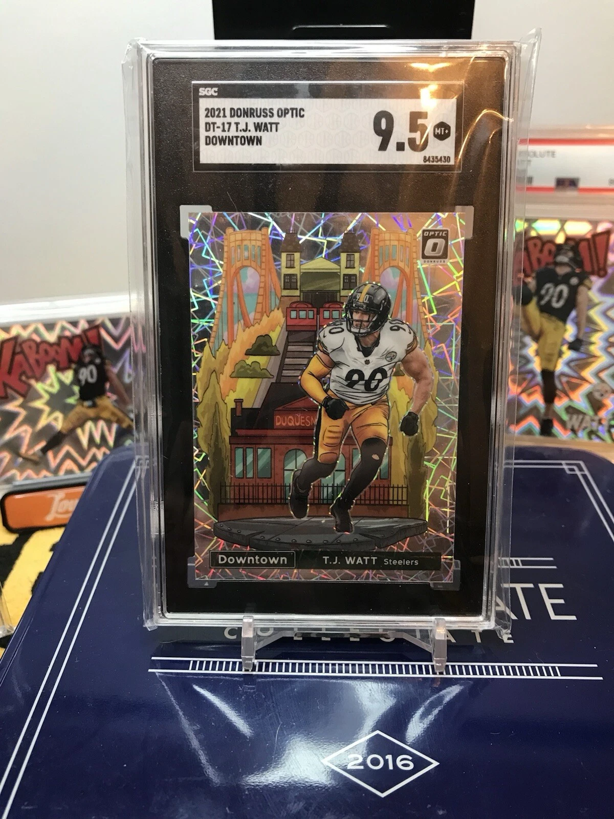 Calling all serious collectors and Steelers fans  this is a must-have defensive gem. Up for grabs is the 2021 Donruss Optic Downtown T.J. Watt, professionally graded SGC 9.5 Mint+, and one of the most iconic Super Short Print (SSP) case hits from the 2021 Optic Football set.