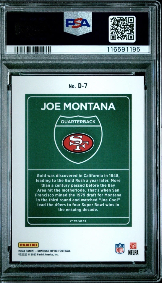 The 2023 Donruss Optic Joe Montana Downtown! Laser Prizm SSP #D7 – PSA 9 Mint is a card that checks every box: rarity, legendary status, premium insert, and eye-popping design. As the market continues to prioritize high-grade, short print inserts of Hall of Famers, this card stands out as both a collector’s trophy piece and a solid investment asset.
