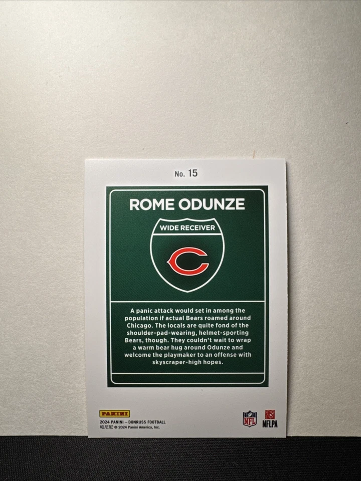 The 2024 Panini Donruss Downtown! Rome Odunze #15 (RC) is a rare and beautiful addition to any football card collection. With its case-hit rarity, rookie-year significance, and premium design, this is one of the most desirable cards of the 2024 season.