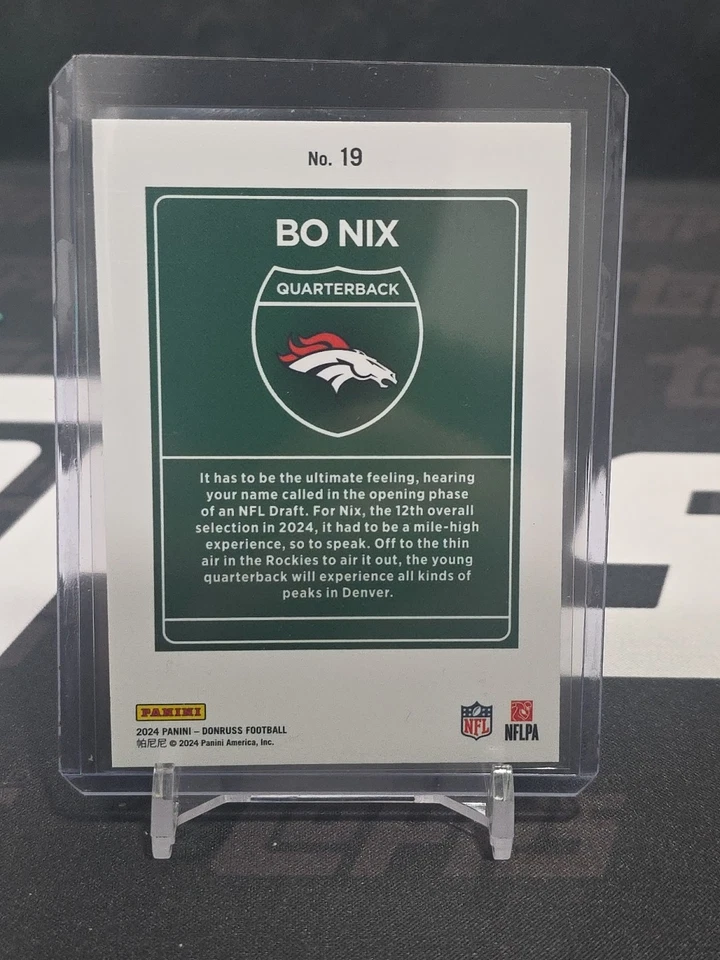 Introducing one of the most anticipated rookie cards of the 2024 NFL season — the 2024 Panini Donruss Optic Downtown Bo Nix #19 (RC). This Super Short Print (SSP) is a true case hit, featuring Denver Broncos rookie quarterback Bo Nix in Panini’s most iconic insert line: Downtown!