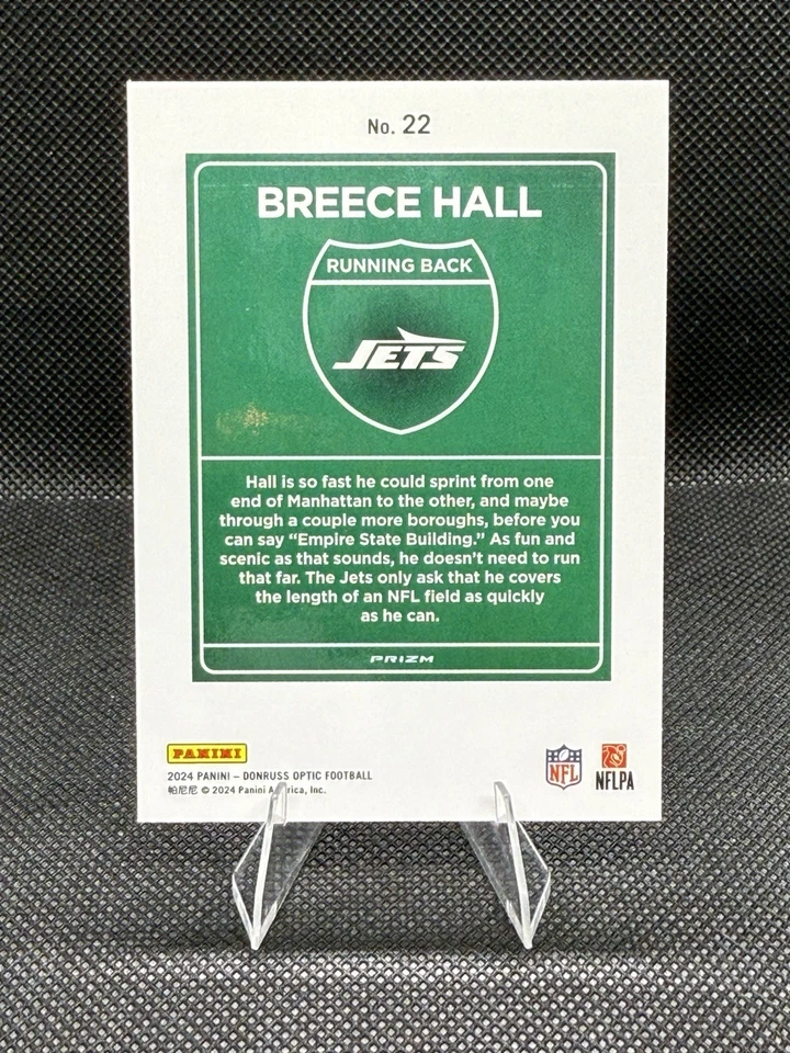 The 2024 Panini Donruss Optic Downtown Breece Hall #22 is a Super Short Print (SSP) case-hit insert featuring the rising star running back for the New York Jets. As part of the fan-favorite Downtown! insert line, this card blends elite rarity, bold design, and high collector value.