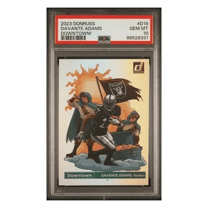 Take your football card collection to the next level with the 2023 Panini Davante Adams Donruss Downtown #D-19, graded a PSA 10 GEM MINT. This Super Short Print (SSP) insert is one of the most iconic case hits in the hobby, combining rarity, visual appeal, and one of the NFL’s top receivers in peak form.