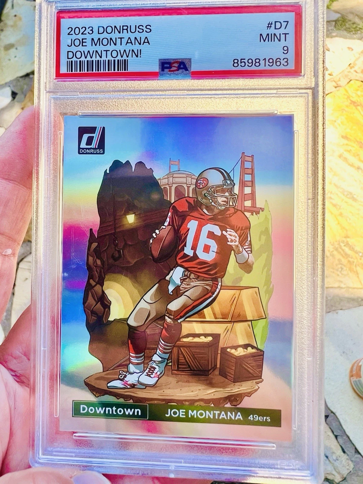 The Joe Montana 2023 Panini Donruss Downtown! #D-7 SSP PSA 9 is a showcase piece for any serious NFL card collector or Joe Montana fan. Combining legendary status, eye-catching design, and rarity, this card is a standout addition to your collection or investment portfolio.